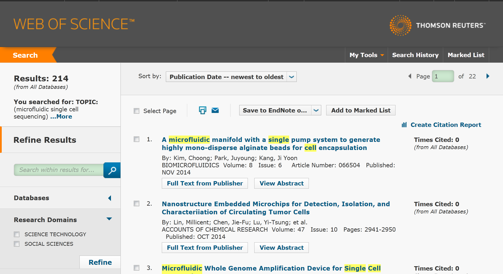 比如我现在想看一下微流控单细胞测序(microfluidic single cell sequencing)最近的进展时,就去WoS搜: