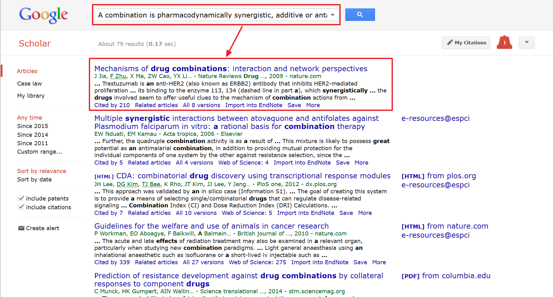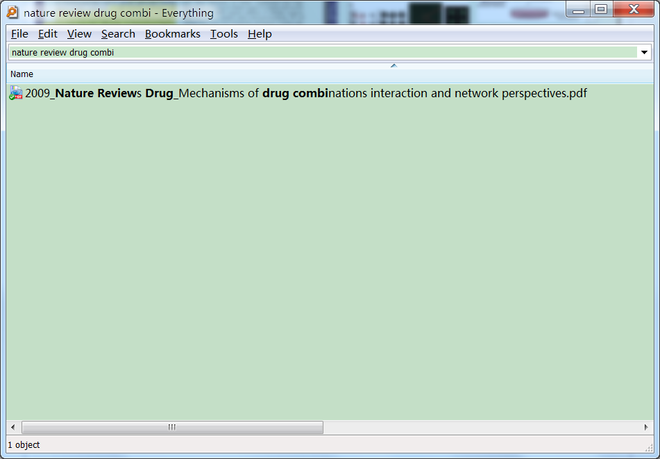 如果搜索目标很明确,比如我现在想找一篇之前在Nature Drug Review上看过的关于drug combination的文章,由于关键词很明确,用Everything直接就从本地找到了,耗时不超过3秒。