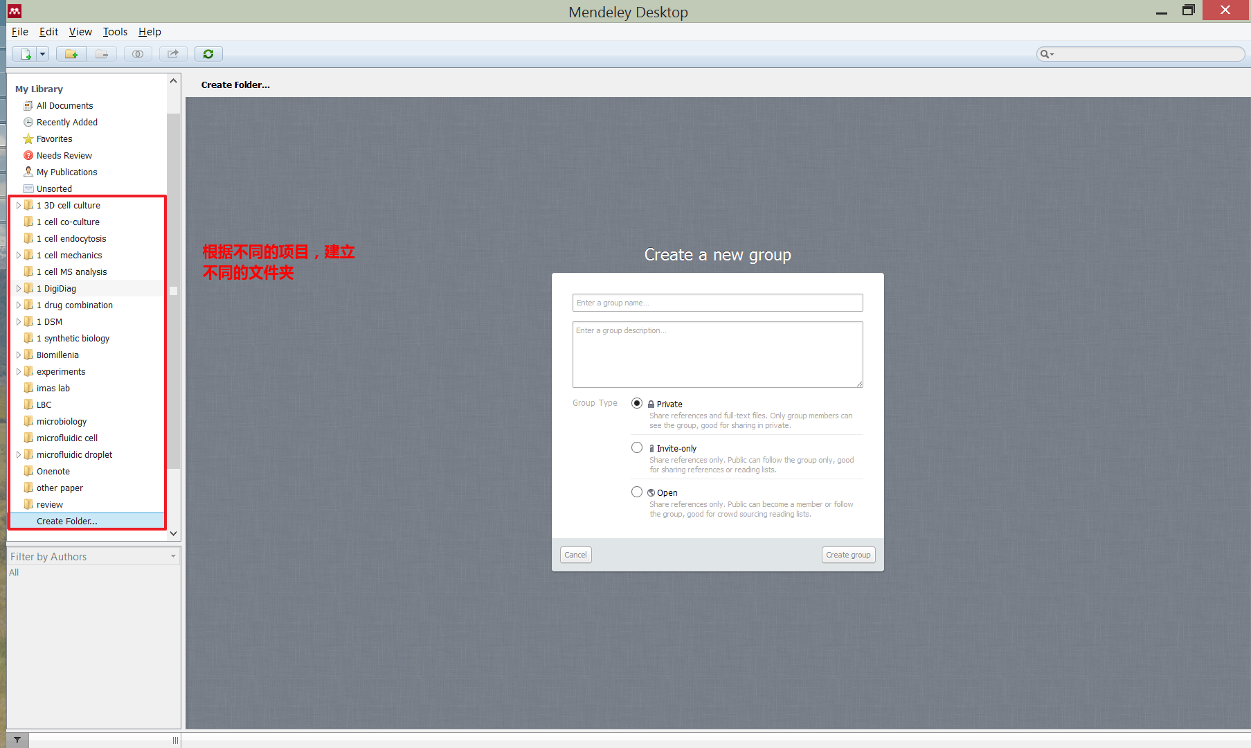 在新项目(写一篇综述,开始一个新课题或者完成一份大作业)开始之前,我会在Mendeley中根据不同项目,建立一个新文件夹。