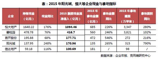 除了融资带动了企业资金增长之外,伴随着 2015年房地产销售市场回暖,多数房企销售大幅增长,部分房企采用了降价等促销手段大力去库存,加强销售回款,有的房企投资力度相对较小,最终也促使房企持有的现金量增幅更为明显,进而成就了一个个的地王。