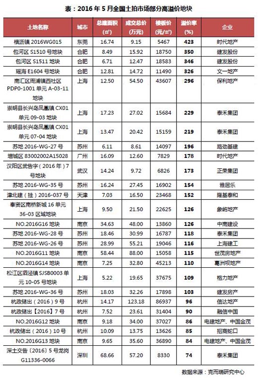 报告内容 今日,合肥再掀土拍“高潮”,12宗地收金96亿,其中建发更是两度以溢价率超340%竞得土地,为当下“高烧不退”的土地市场再添一把火。5月11日,格力地产以楼板价37675元/平方米拿下上海泗泾地王;5月13日,南京连拍7总地块,一日收金近249亿元;此后又有保利地产、泰禾、时代、正荣等企业于上海、广州、苏州、武汉等多个城市拍出地王;上周五信达地产更是以123亿元、溢价率95.94%抢下杭州滨江区杭政储出(2016)9号地块,造就全国总价地王。