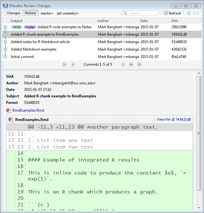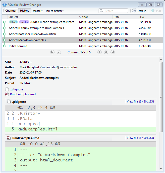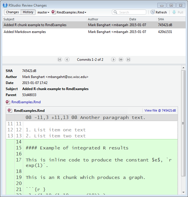OverviewThis article will introduce you to R Markdown, a document writing program, and demonstrates using RStudio's Git diff, a tool to examine when prior changes were made to a project. These tools are part of RStudio's development environment. They help you work more efficiently.