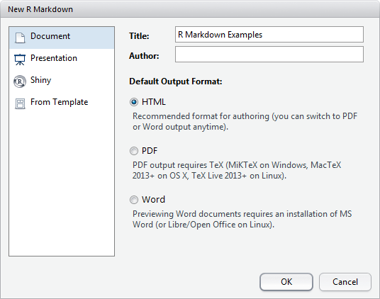 A New R Markdown window will open. Enter a title, here we will use "R Markdown Examples". This is the title which will be displayed in the document and is not the name of the file.