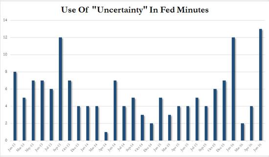 美联储6月会议在英国公投以前举行,当时会议如市场预期并未加息,以上会议纪要显示的谨慎态度不算意外。不过,会议纪要倒有一个有趣的现象。在美联储6月的会议纪要中,“不确定”(uncertain)这个形容词出现了13次,要是把“不确定性”(uncertainty/uncertainties)这个名词的单复数算在内,联储提到不确定就有43次。