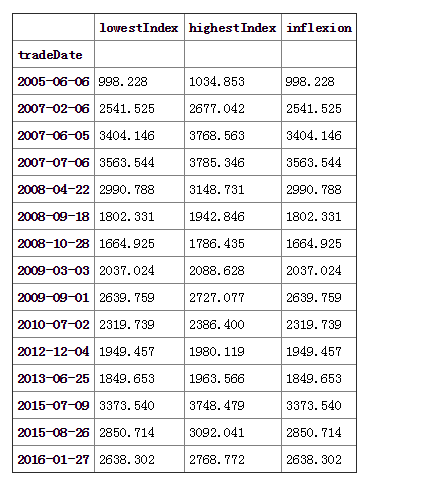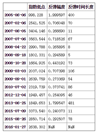 接下来统计一下每个底部反弹的时间长度,要注意的是 2016-01-27 2638.302 最后一个底部其反弹多少还不能确定。