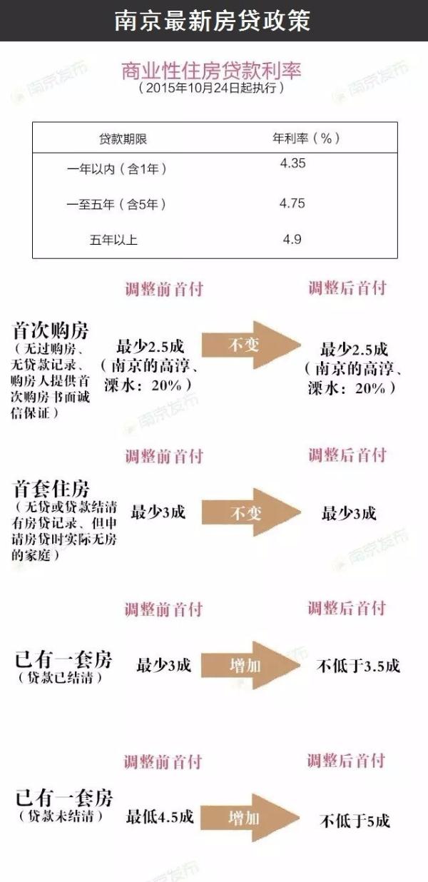 就南京方面而言,首套房仍按前期政策首付25%(高淳、溧水20%)不变;对拥有1套住房且相应购房贷款已结清的居民家庭,最低首付款比例调整为不低于35%(除高淳、溧水);对拥有1套住房且相应购房贷款未结清的居民家庭,最低首付款比例调整为不低于50%(除高淳、溧水)。