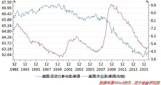 第三,美国就业形势不如预期的强劲。特朗普在竞选阶段一直批评,美国经济强劲增长和失业率下降是虚假的,特别是美国政府发布的10月份失业率降至4.9%,主要原因可能有两方面:一是2008年以来美国劳动参与率下降了3.4个百分点(参见下图),这既有美国人口逐渐老龄化的原因,也有大量劳动年龄人口在经过长期失业后丧失工作能力的原因;二是大量的临时就业岗位,被统计称为新增就业岗位。因此,美国的实际就业形势,可能不如预期的那么强劲。