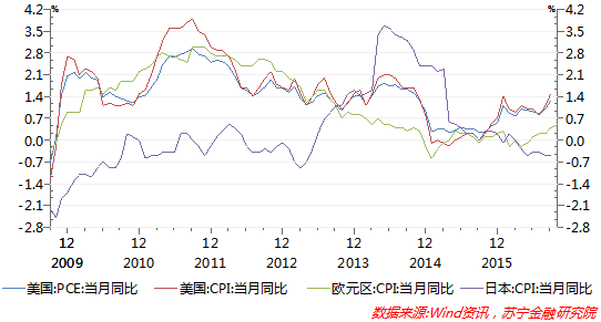 第二,美国通胀水平不支持美联储实行高利率政策。近几个月来,美联储利率政策最为关注的两大通胀指标CPI和PCE(个人消费支出)尽管有所回升(9月份分别为1.5%和1.25%),但离美联储的目标值2%仍有不小的差距,也显著低于历史平均水平。与此同时,欧元区和日本等全球主要发达经济体仍处于通货紧缩的泥潭中,在此大环境下美国出现较为显著的通胀压力的可能性不大(参见下图)。因此,当前美国显著提高利率的必要性不大。