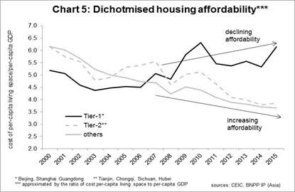 主要房地产市场的衡量指标,如房价可承受性和抵押借款规模掩盖了结构失衡,并没有反映出市场泡沫。许多观察家针对房价可承受性的观察仅仅局限于一线城市,但得益于快速的收入增长,一线城市以外的房地产价格上涨并没有像这些观察家认为的那样损害房地产价格的可承受性。事实上,其它城市(一线城市和二线城市之外的城市)在房地产价格可承受性方面还出现了改善(图5)。