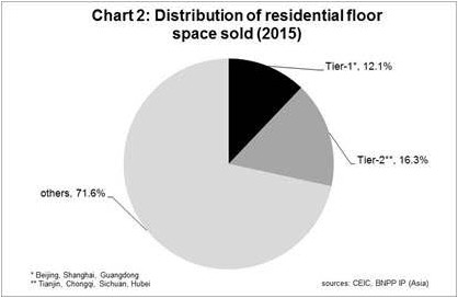 图2:已售居住建筑面积分布(2015);一线城市12.1%,二线城市16.3%,其它城市71.6%