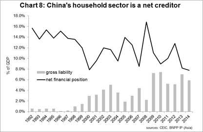 最重要的是,中国的家庭部门在经济中是净债权人。中国住户的净资产达到了中国国内生产总值的8%,而家庭部门的总债务不足国内生产总值的7%(图8), 而美国和日本的这一比例分别为95%和66%。这些都不构成在中国银行系统中引发系统性风险的条件。