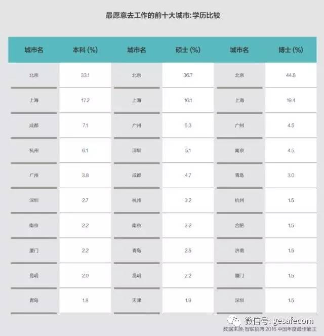 无独有偶,在智联招聘《2016中国年度最佳雇主年度总报告》上,深圳在本科生最愿意去工作的前十大城市中,排名第六;在博士生群体仅排在第十位,只有1.5%的博士把深圳作为求职首选。似乎学历越高,对高房价越心生畏惧。