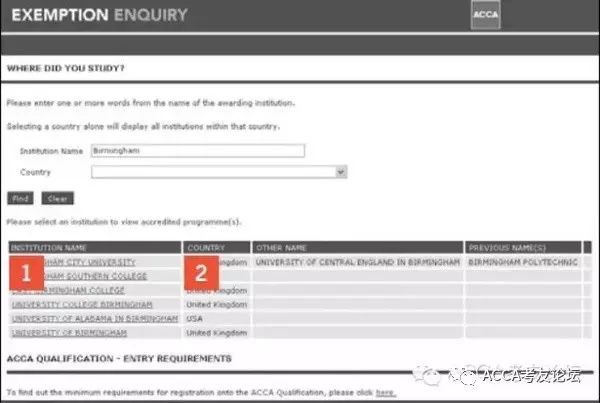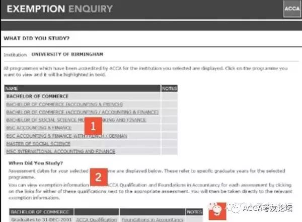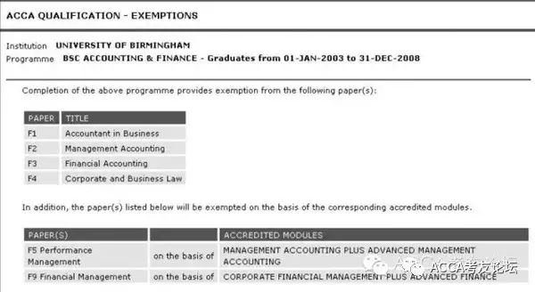 【上图显示】:A student who graduated with a BSc in Accounting and Finance between 1 January 2003 to 31 December 2008 from the University of Birmingham will gain exemption from Papers F1, F2, F3 and F4.