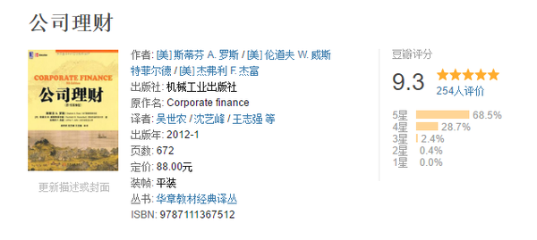 豆瓣简介:斯蒂芬A.罗斯、伦道夫W.威斯特菲尔德、杰弗利F.杰富编写的《公司理财(原书第9版)》分8篇,共31章,涵盖了公司财务管理的所有问题,包括资产定价、投资决策、融资工具和筹资决策、资本结构和股利分配政策、长期财务规划和短期财务管理、收购兼并、国际理财和财务困境等,并且新增了股票和债券的内容。