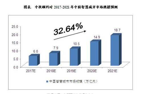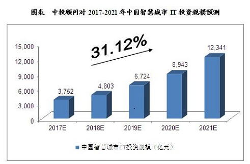 综合以上因素,我们预计,2017年我国智慧城市IT投资规模将达到3,752亿元,未来五年(2017-2021)年均复合增长率约为31.12%,2021年IT投资规模将达到12,341亿元。