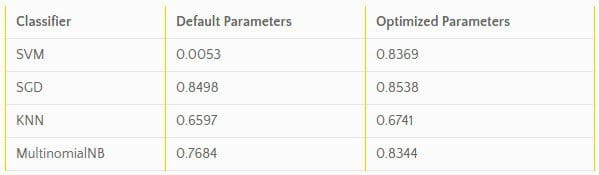 The table below shows the F1 scores obtained by classifiers run with scikit-learn's default parameters and with hyperopt-sklearn's optimized parameters on the 20 newsgroups dataset. The results from hyperopt-sklearn were obtained from a single run with 25 evaluations.
