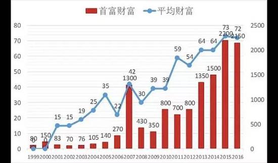 超级富豪的增速更是惊人。瑞信报告称,2000年以来全球超高净值个人的数量增加了216%,而中国增加了100倍。按胡润榜数据,2000年内地首富为荣智健家族(19亿美元),其次为刘永行及其兄弟(10亿美元),而2016年仅10亿美元财富以上富豪就达594位,排名前两位的王健林家族和马云家族财富都超过了2000亿人民币。王健林家族的财富(2150亿),按中国成人人均财富15.8万元计算,相当于136万人的总和。