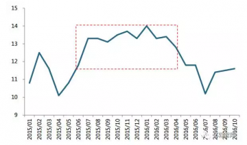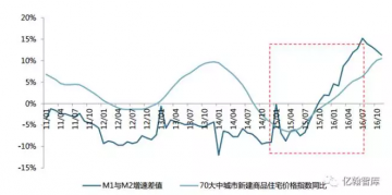 2015年至2016年3月,央行5次降息6次降准,货币流动性迅速增加。在此期间,GDP增速放缓和2015年股市暴跌,进一步促使政府放宽货币政策,M2同比增速维持在13.5%的速度高速增长。2016年,央行货币政策依旧宽松,虽然M2同比增速回归11%左右,但M2存量已涨至较高水平,使M2增量仍较政策放宽之前高。到2016年末,M2绝对量高达155万亿,也就是说如果同比增长10%,就是15.5万亿的绝对量,放到每个月M2增量将近1.3万亿。