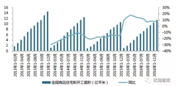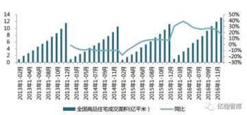 2016年全国商品房成交量达15.7亿平米,很可能成为历史至高点。2014年市场下行,全国商品住宅成交量同比呈负增长态势,2015年2季度末同比回正。伴随2015年3季度以来市场的不断回暖,全国商品住宅成交量同比增速明显加快。2016年全年商品住宅成交13.8亿平米。