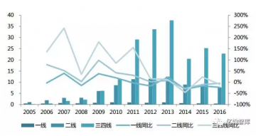 各能级城市2016年土地成交总量均较2015年有所降低,其中一线、三四线城市土地成交总量下降最明显,同比分别减少23%,10%;二线城市土地成交总量下降有限,2016年土地成交总量较去年同期减少5%。土地成交量是新开工的先行指标,在2016年土地新开工的面积下降的前提下,2017年新开工情况不容乐观。
