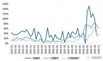 2016年一二线城市土地价格提升明显,尤其是一线城市,地价高企,而三四线城市地价较为平稳,波动不大。各能级城市溢价率均上升,受地王的影响,一二线城市溢价率攀升最明显。