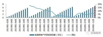 全国商品住宅新开工面积呈下降趋势,受2015年新开工基数影响,2016年商品住宅新开工总量仅高于2015年,比2014年和2013年的新开工绝对量要低。并且,从绝对量上看,新开工面积回到2011年前后的水平。相较于商品住宅销售面积,2016年的新开工水平已经非常之低,也反映了大部分房地产企业开工意愿并不高。全国房地产开发投资总额创新高,但增幅有限,从行业的大趋势来看,开发投资已经出现疲态。