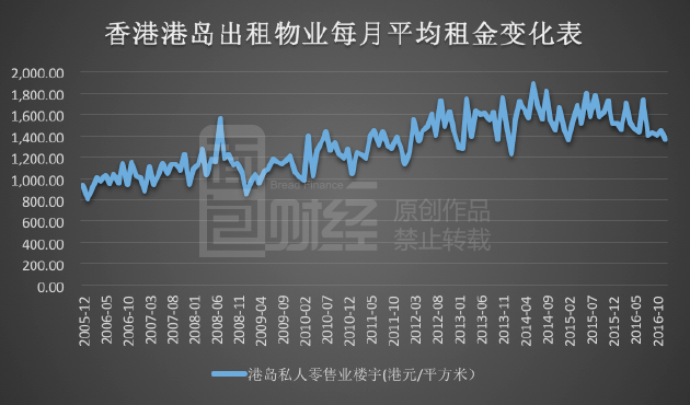 2016年6月至年末,港岛私人零售业楼宇每月租金价格由1738港元/平方米降至1366港元/平方米,降幅27.23%。而地处香港商业中心的铜锣湾,作为全世界租金最贵的地段,去年下半年租金下挫约6%至743港元/平方米。