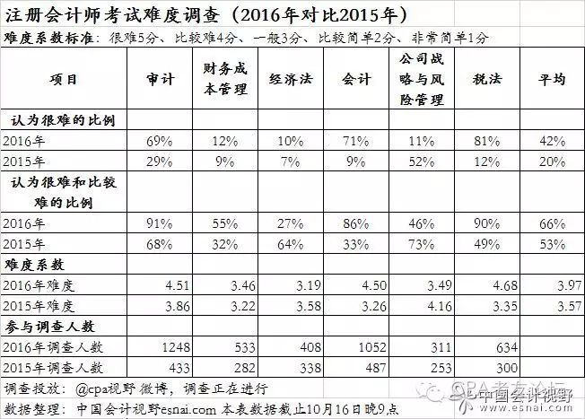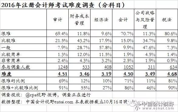 根据中国会计视野在微博发布的考试难度调查,以5为很难、4为难、3为一般,4186人次投票结果是:本次考试的科目难度总体水平是3.97,很接近于难。难度较去年的3.57有显著提高。最难科目为税法(4.68),然后为审计(4.51)、会计(4.5)、财务成本管理(3.46)、公司战略与风险管理(3.49)、经济法(3.19)。