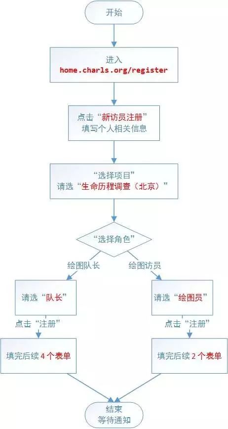 选择“新访员注册”,填写注册信息,下方项目选择“生命历程调查”。报名绘图员的同学,角色选择“绘图员”;报名绘图队长的同学,这里的角色请选“队长”。