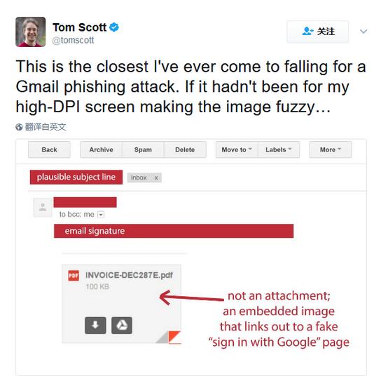 这个钓鱼邮件会伪装成为Google用于标记PDF或者WORD文档的图片,不过这些图片会嵌入在邮件正文中。当用户点击之后,就会引导受害者至“Google登陆页面”。