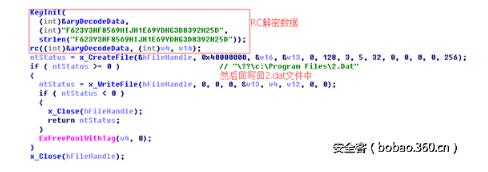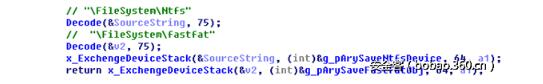 驱动加载之后再次通过RC加密回写数据“2.dat”,并还原“ntfs”和“fastfat”的设备栈,隐藏第二个驱动代码。