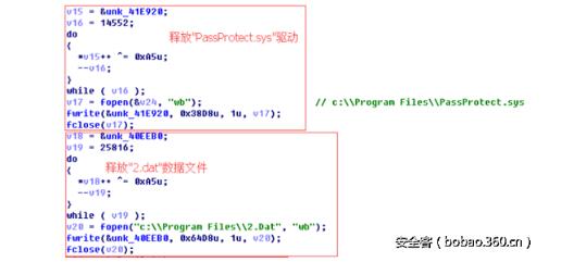 该程序实际上是一个加载器,第一次运行后,后期都不再依靠该加载器运行。加载器通用于32位 和64位多个操作系统平台,根据不同系统平台释放不同文件。数据解密之后释放到系统目录下(PassProtect.sys和2.dat)。