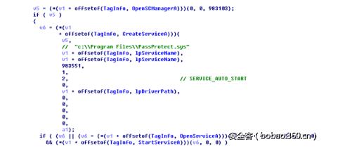 Shellcode中加载“PassProtect.sys”驱动文件,驱动加载状态为自动启动(开机自动加载)。