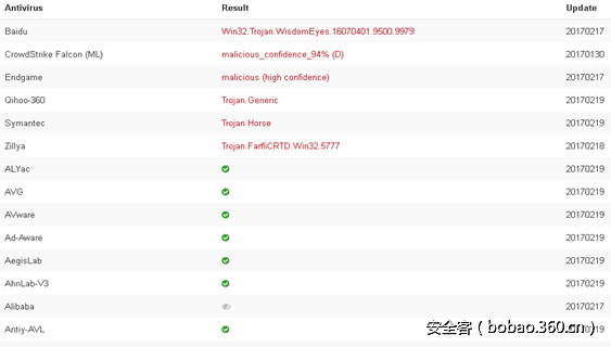 从上面分析看出,程序开发者通过各种技术手段,费劲心思,最终达到锁主页的目的。随着目前各大杀软对流氓推广软件的封杀,常规的推广手法已不在适用,升级后的对抗已经不在简单的修改注册表。更为猥琐和流氓的推广方式纷纷出现,各显神通,一不留神便被乘虚而入。当用户放行这个程序,流氓推广已经势不可挡,直捣黄龙。假如作者狠一点,后果将是不可不堪设想。所以笔者在这里提醒各位读者,对这类所谓解码器最好从正规网站下载。由于程序经过免杀处理,能够查杀的杀毒软件并不多(见下图VT扫描结果)。如果系统中曾经运行过该类解码器或播放器,可以安装下列可查杀的杀毒软件进行查杀。最后祝愿各位免受“流氓”困扰,金龙索玉柱,百毒不沾身。
