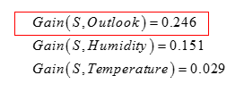 同理,计算温度、湿度、天气大体情况的信息增益