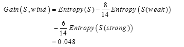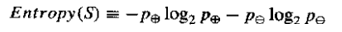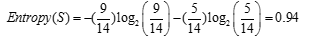 原始信息为:在观测数据的14天中,9天可以进行网球比赛,5天不能,记为:S=[9+,5-]。计算原始信息熵为:![]()