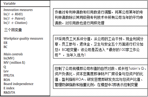 本文的专利数据有三个来源,分别是来自NBER专利引用数据库中的1976-2006年所有由美国专利商标局授权的专利数据、Kogan等(2012)个人整理的2007-2010年间的美国专利数据(https://iu.box.com/patents)、哈佛商学院的专利数据库中关于专利的技术分类(http://dvn.iq.harvard.edu/dvn/dv/patent)。而工作环境质量的数据一是来自《财富杂志》每年统计的美国上市公司中最好的100家工作去处,二是来自KLD数据库的员工关系评分。公司董事数据来自RMG,财务数据来自Compustat数据库,房价下跌百分比数据来自ZHVI,劳动力数据来自美国劳动统计局。最终选取1998-2010年的美国1500家上市公司,共8911个观测值。