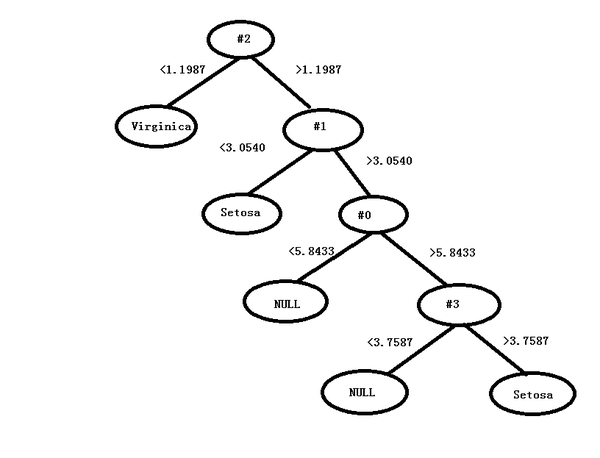 其中如(2,4)分别代表了第一个最佳的分割属性(如:叶长)和该次属性结点选择中总共有几个剩余属性,最后的"{ }"中“<”代表进入了下一个右侧树枝,">"代表进入了上行左侧分支,数字集合代表各属性下面划分类别的阈值。如下所示: