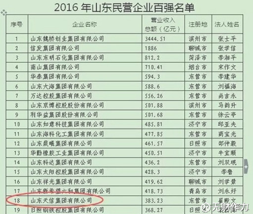 山东天信集团有限公司是东营的大型民企行业,业务主要涉及纺织、光伏、铜加工、房地产等。去年营收总额高达383.23亿人民币,在2016年山东民营企业百强名单中位列18位,在2016年民营企业500强中排名第341位。