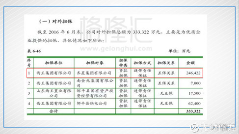 无独有偶,对于身处债务风暴漩涡之中的齐星集团,西王集团作为贷款的担保方,也深受其害。据上海清算网《西王集团有限公司2017年度第二期超短期融资券募集说明书》中披露,西王集团与齐星集团为互保关系,西王集团对齐星集团的贷款提供连带责任担保,截止2016年6月末,涉及金额24.64亿元。