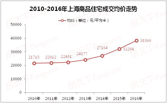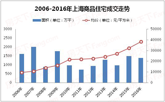 上海房天下数据监控中心统计,2016年度上海新房市场商品住宅共计成交10.84万套,与去年相比下跌9.83%,全年成交面积为1382.89万平,同比去年下行7.07%;年度成交均价为38369元/平,与去年相比上浮18.85%。