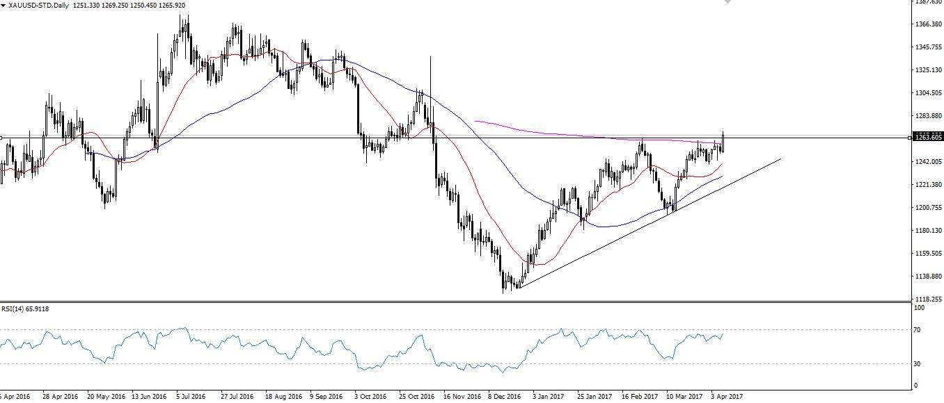 在操作方面:在美国对叙利亚发动导弹袭击后,市场掀起避险潮;亚洲交易时段,伦敦现货黄金价格飙升至去年11月以来最高水平。黄金技术上强势突破200日均线压力位,技术上强力看多。现在市场比避险情绪大于对非农数据的乐观预期,若本次非农数据对金价有所打压,只要金价维持在1260上方,多单仍可积极进场。