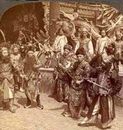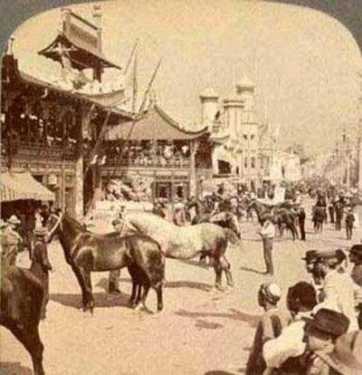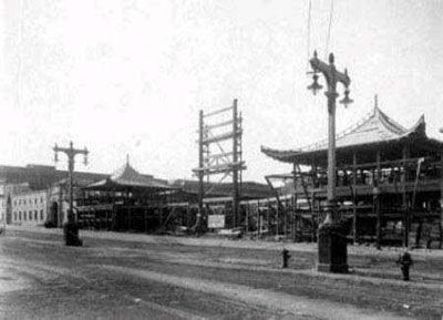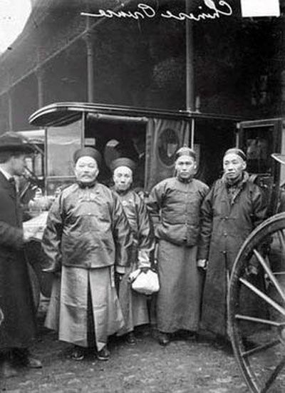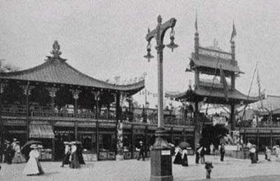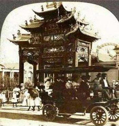 “中国村”入口,可见各色衣着洋人穿梭来往。