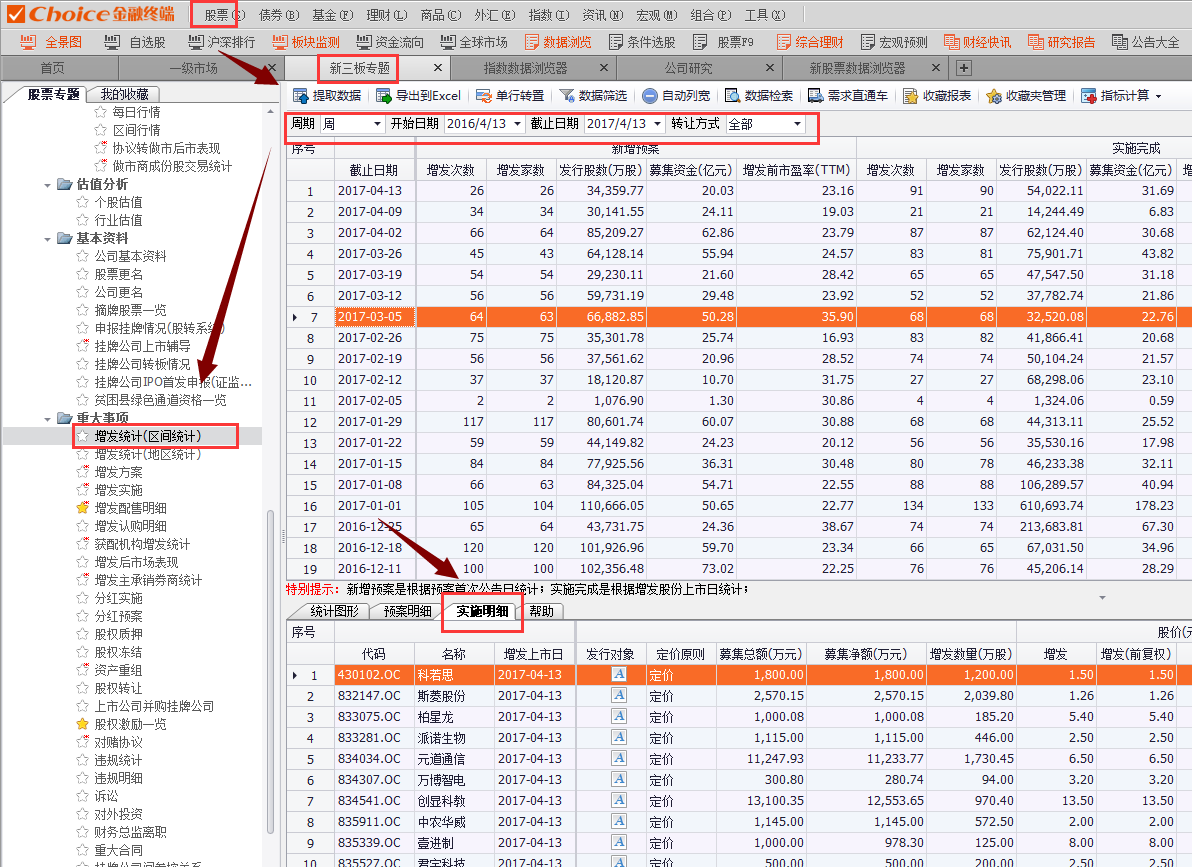 2.选择增发统计(区间统计)专题,同样根据需要设置条件,在下表中还可以看到具体的实施明细