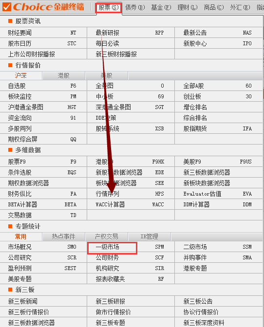 1.打开Choice金融终端,点击股票-一级市场