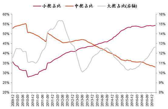 有人提到,挖掘机销量的大增与设备更新周期有关,这也不无道理。有一种说法是设备更新周期等于两个库存周期之和,即6-8年。这让我想起去年汽车销量大增的原因,也与汽车的更新换代周期有关,随着保有规模的增长,汽车更新换代的需求对销量的支撑作用越来越强。一般来讲,70-80%的二手车使用年限在6年以下,汽车的平均更新换代周期约为3年左右,而当前处于一个更新换代周期的末尾。叠加汽车报废补贴政策与购置税优惠政策对需求的透支,2017年汽车销量恐怕不能乐观。今年第一季度,汽车销量仅增加7%,且乘用车的销量负增长,也部分印证了这一点。