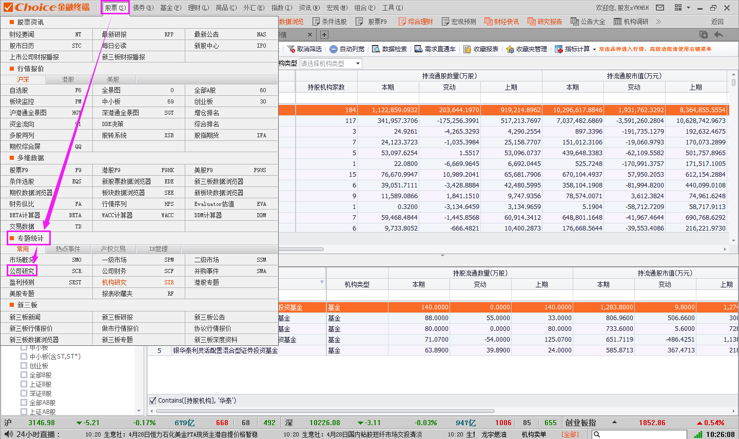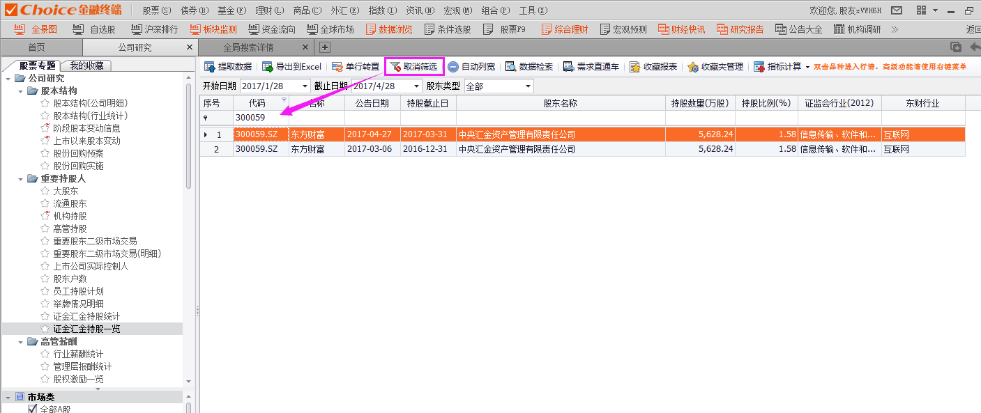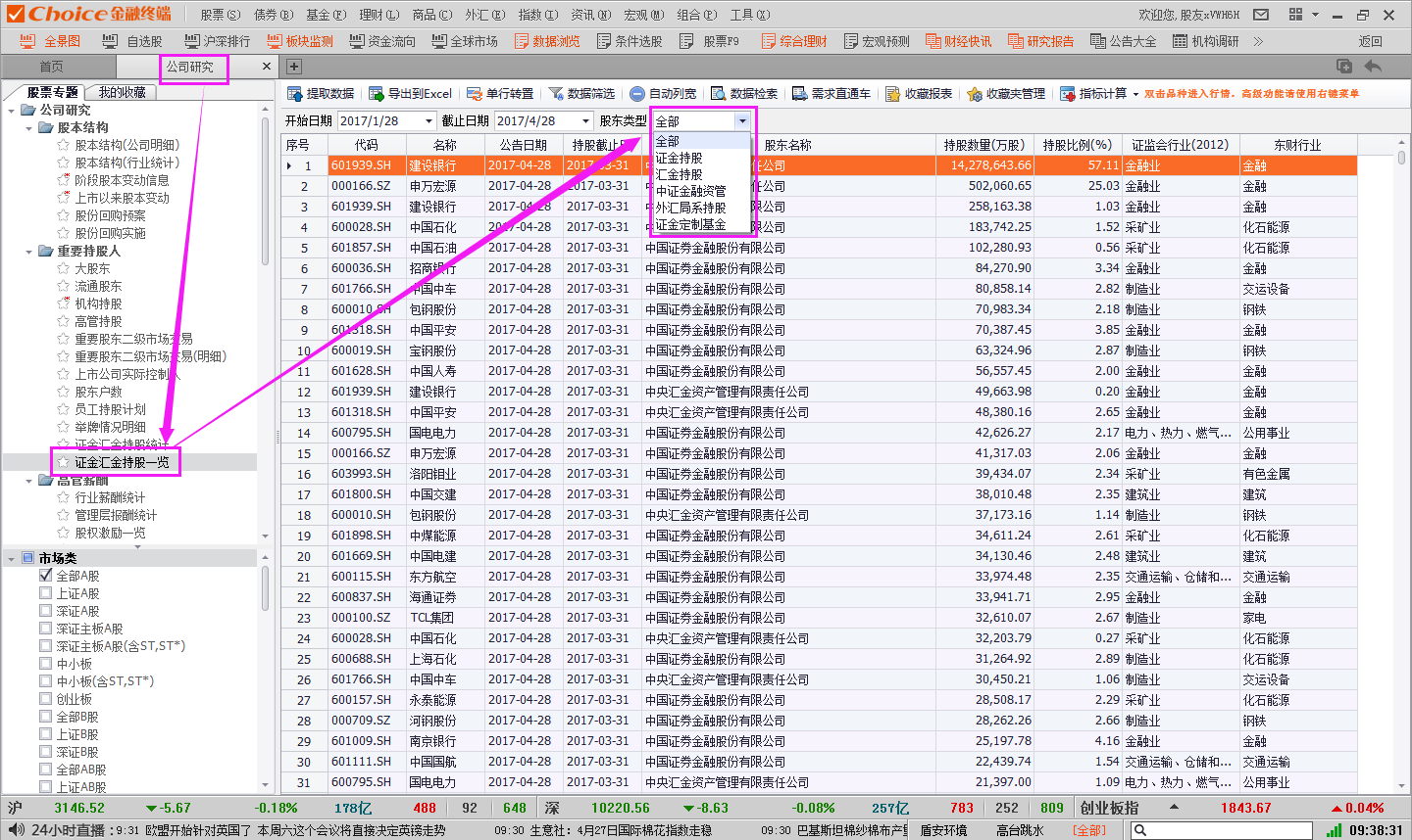 2.点击股票专题-重要持股人-证金汇金持股一览,即可查看数据(股东类型可选)