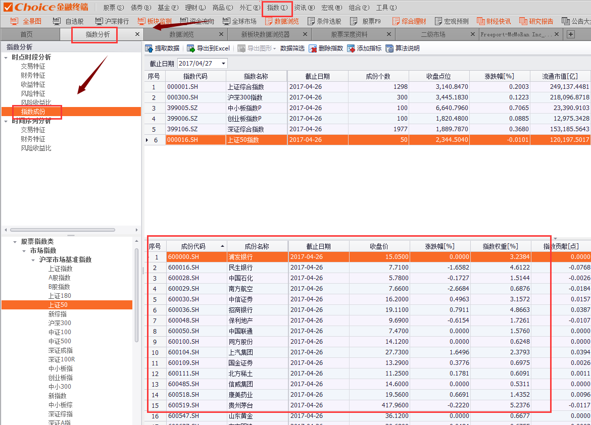 2.选择指数成份专题,左下方双击选择需要查找的指数,即可看到其成分股信息及权重等数据