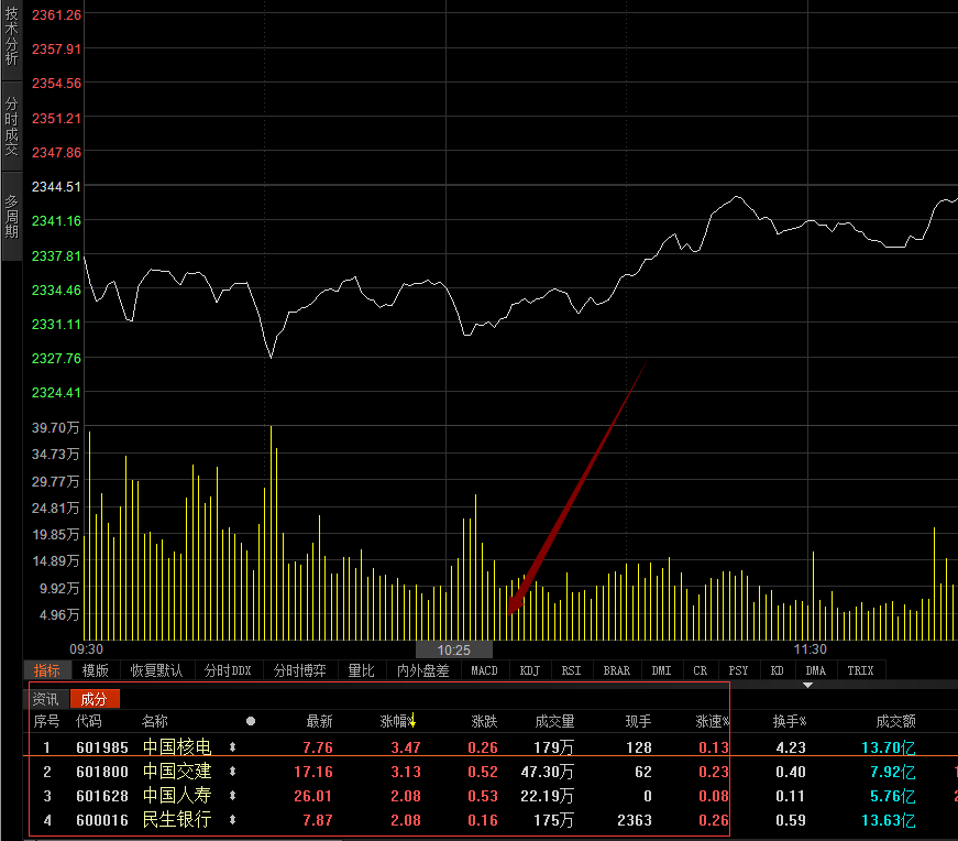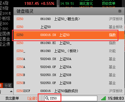 如果要查看某一只指数的成分股信息,可以直接终端右下角敲代码或简称,比如“sz50”,在行情界面也可以看到
