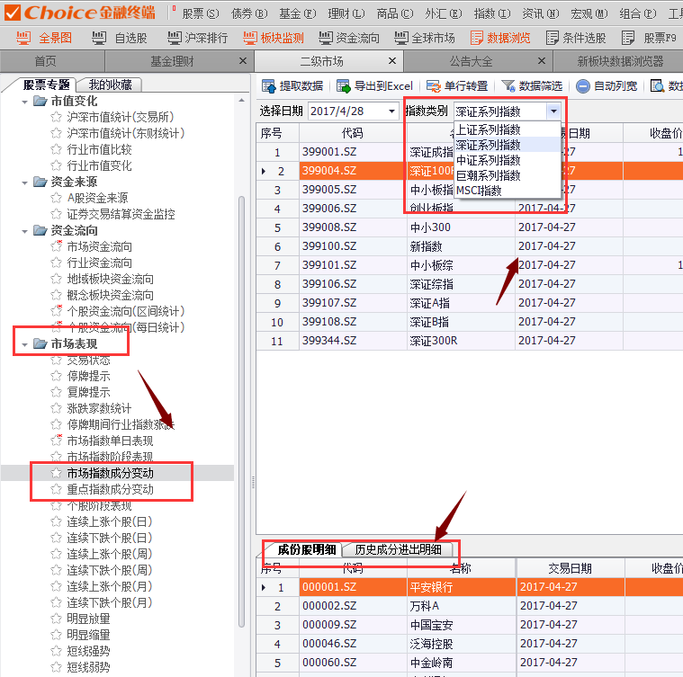 2.选择市场指数成分变动专题,根据需求选择指数类别,然后点提取数据,就可以看到指数对应的成分股明细及历史成分进出明细